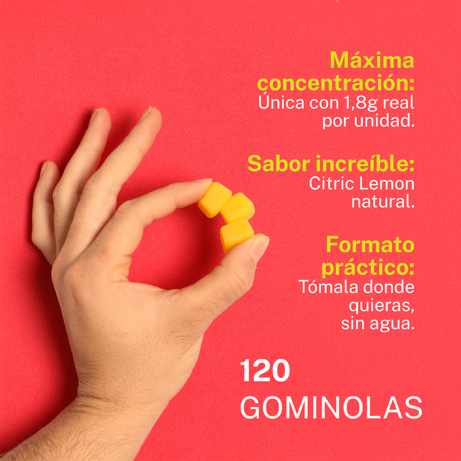 La dosis real más alta del mercado en formato gominola. Solo 2 gummies al día (3,6g) para potencia y recuperación. ¡Sabor a limón, eficacia garantizada!